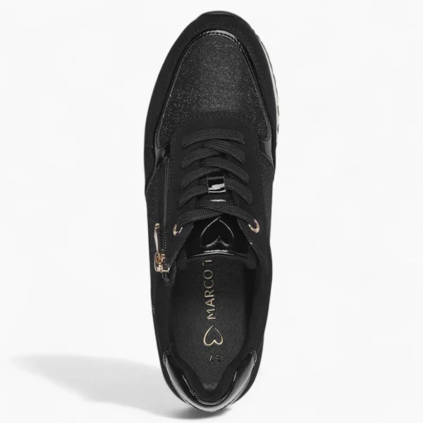 Combine elegance and practicality with this all-black runner from Marco Tozzi. Featuring a mix of glittery textile, black patent, and suede, along with a gold zipper for a touch of sophistication, this shoe is perfect for stylish everyday wear or professional settings.