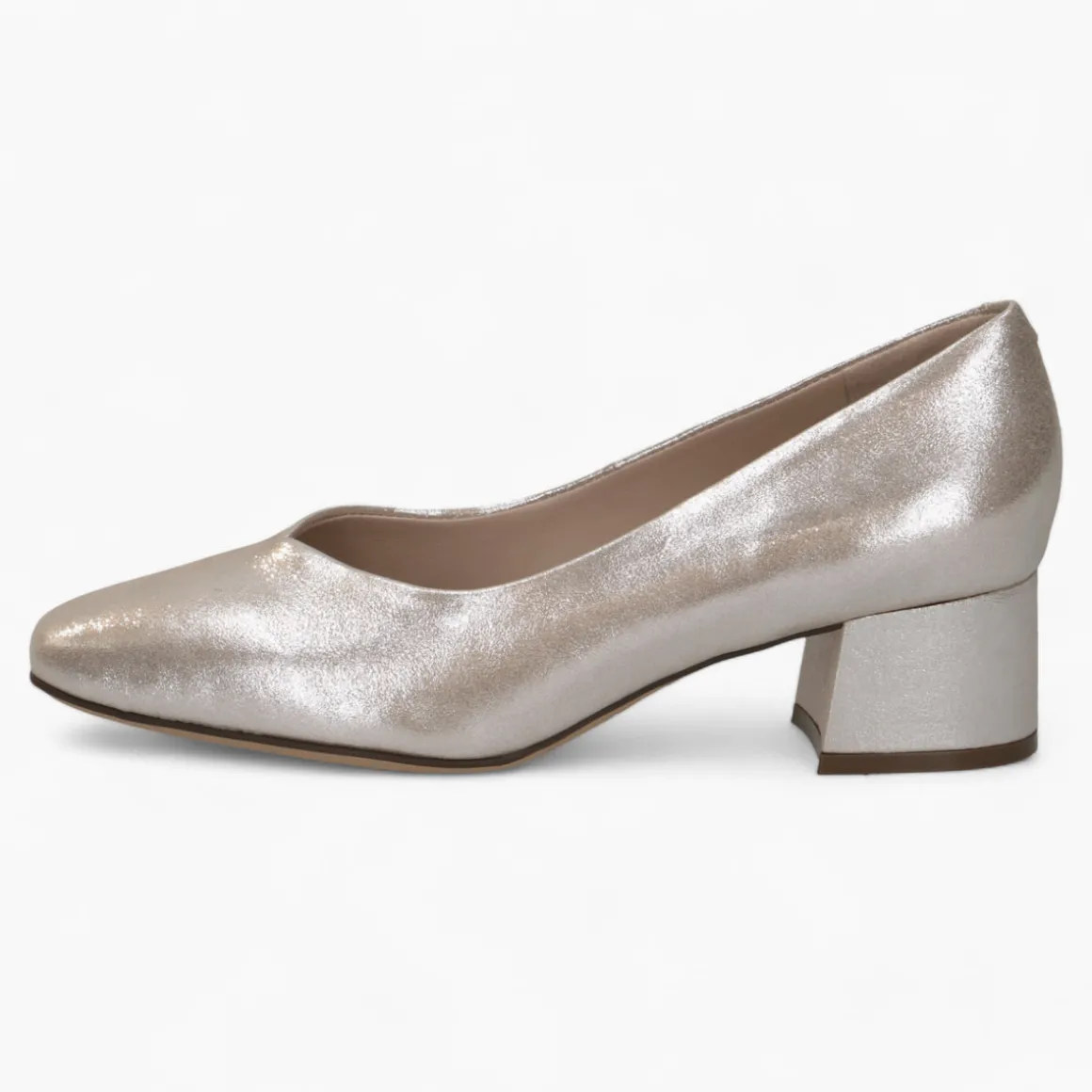 Elevate your occasion wear with this stunning metallic block heel from Caprice. Featuring a square toe, fish cut opening, and ergonomic MEMOTION cushioning, this shoe combines timeless elegance with unmatched comfort. Perfect for weddings and special events.