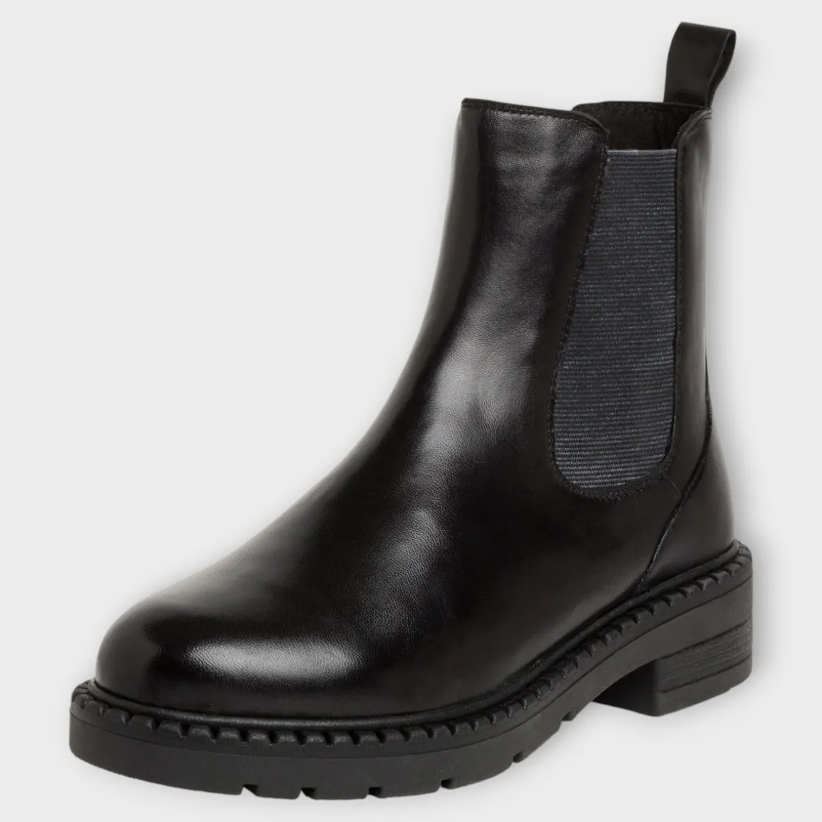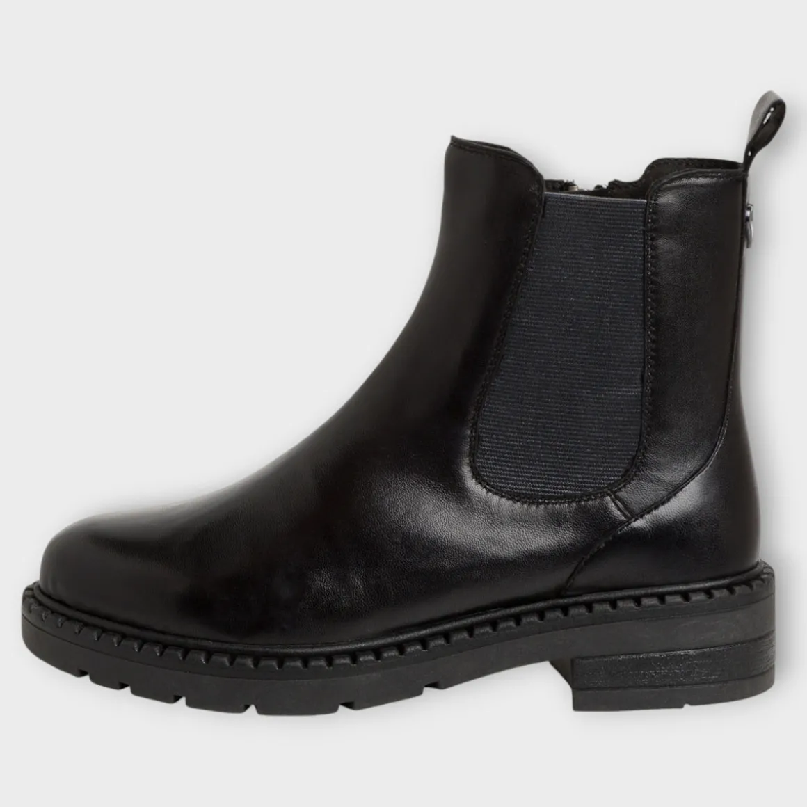 The Marco Tozzi black leather Chelsea boots offer a timeless design with a contemporary twist. Featuring a chunky side sole and a slight block heel, these boots combine classic style with modern comfort. The elasticated panel, side zip, and pull tab make them easy to slip on and off, ensuring both style and practicality.
